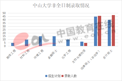 中山大學部分非全日制專業則沒有招到人,測繪工程招生計劃5人、環境工程招生計劃15人、材料工程招生計劃數10人、金融碩士招生計劃數15人,化學工程招生計劃數10人,但最終錄取均為0人。法律碩士(非法學)、會計碩士招生計劃數和錄取數基本持平。