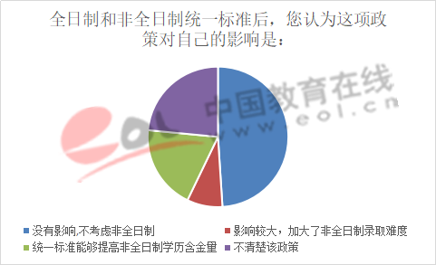 從調查來看,對于非全日制納入統考,統一標準,近半數考生認為對自己沒有影響,不考慮非全日制。仍有近四分之一的考生不清楚該政策。