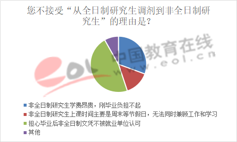 而對于不愿調劑到非全日制專業的原因,46%的考生擔心畢業后非全日制文憑不被就業單位認可。雖然國家規定全日制與非全日制研究生學歷具有相同法律地位,但目前多數事業單位的招聘要求為全日制研究生,隨著2017年招收第一批列入統考的非全日制研究生畢業,非全日制研究生需要國家和社會給予更多的政策支持與關注。