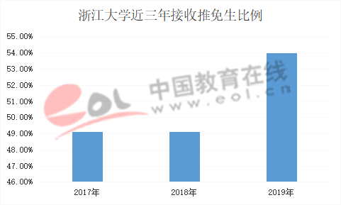浙江大學2017年、2018年推免生占比均為49.09%。 2019年接收推免生比例由于全日制招生計劃人數的縮減而大幅提升,占比高達54%。