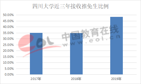 四川大學2017年接收推免生數量為2000人,2018年和2017年基本持平,2019年接收推免生數量增至2800人,占比提高到48.44%。