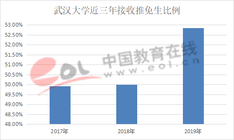 武漢大學2017年接收推免生數量為2700人,占比49.91%,2018年推免占比50.00%,2019年推免占比超過半數,增加至52.85%。