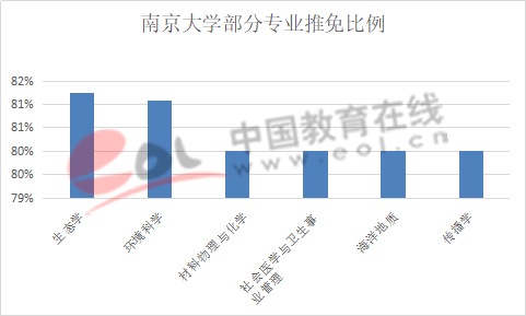 2019年南京大學的部分專業接收推免比例達到或超過80%,其中材料物理與化學、海洋地質、傳播學、社會醫學與衛生事業管理專業達到80%,生態學、環境科學專業推免比例達到81%。