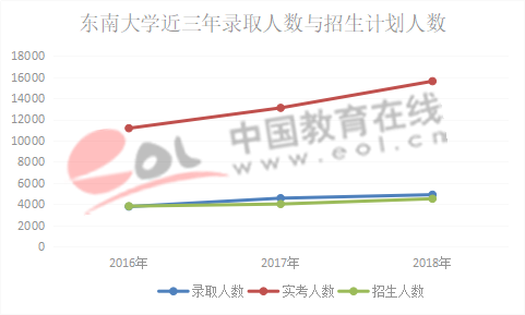 東南大學2017年錄取人數增至4553人,招生計劃數為4000人,錄取人數高于招生人數553人;2018年錄取人數高達4882人,招生計劃數為4500人,錄取人數高于計劃數382人。 可以看出,近兩年,東南大學碩士研究生錄取人數高于招生計劃人數,而實考人數遠超錄取人數和招生計劃人數,并呈現明顯的增長趨勢。