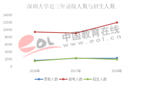 深圳大學2016年碩士研究生錄取統考人數為1624人,招生計劃數為1469人,報考人數9405人;2017年錄取統考人數增至2232人,招生計劃數為2294人,報考人數9086人;2018年錄取統考人數高達2301人,招生計劃數為1904人,報考人數增至11981人。