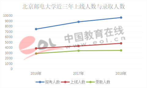 北京郵電大學2016年碩士研究生錄取人數為2877人,上線人數為3844人,報考人數7465人;2017年錄取人數增至3402人,上線人數為4291人,報考人數增至8828人;2018年錄取人數高達3461人,上線人數為4792人,報考人數高達9635人。