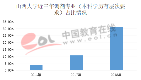 2016年,山西大學接收調劑的專業共108個,在調劑專業中提出對考生本科院校有層次要求的有4個,占比3.7%,2017年山西大學接收調劑的專業共110個,其中對考生本科院校有層次要求的有12個,占比10.91%,2018年山西大學接收調劑的專業有109個,其中對考生本科院校有層次要求的有34個,占比增至31.19%。