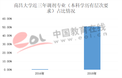 2016年,南昌大學接收調劑的專業共106個,在調劑要求中提出考生本科需畢業于985/211高校的調劑專業僅有1個,占比0.94%,2018年南昌大學接收調劑的專業有59個,其中提出本科需畢業于985/211高校的調劑專業有30個,占比高達50.85%
