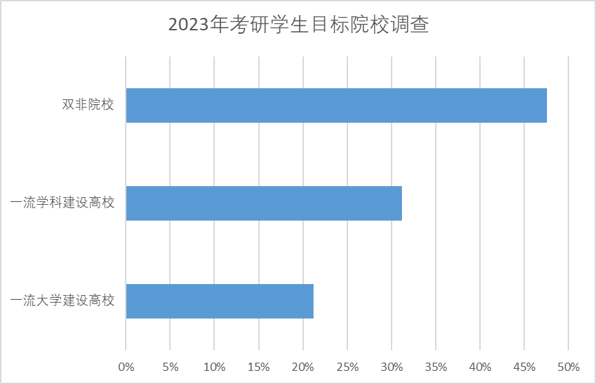 同樣,根據中國教育在線開展的2023年考研學生目標院校問卷調查顯示,今年參加考研的考生中,有近五成的考生目標院校為雙非院校;其次是一流學科建設高校,占比超過三成;最后是一流大學建設高校占比兩成多。