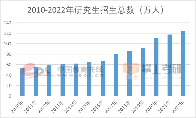 近年來,我國研究生招生規模始終呈現快速增長趨勢。研究生招生總人數從2011年的56萬增長至2022年的124.25萬。十年間,研究生招生總人數增長一倍多。