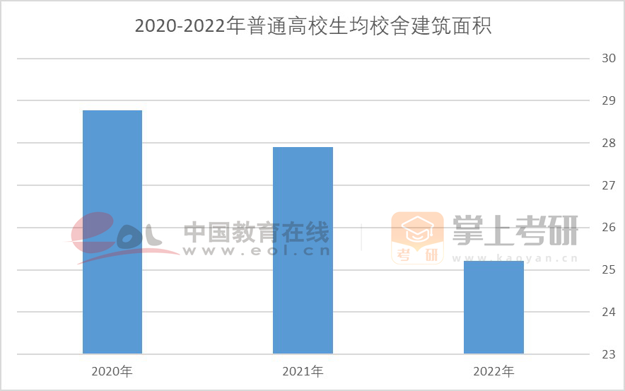 2020年高校生均校舍面積28.77平方米,2022年高校生均校舍面積下降到了25.21平方米。
