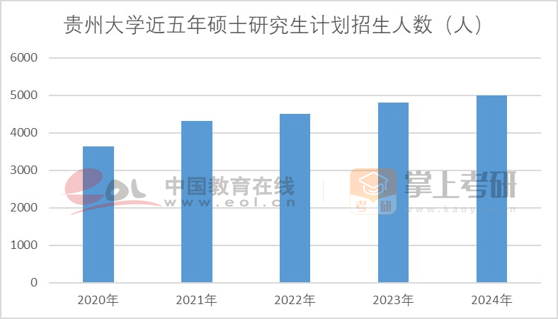雖然各校招生規模不斷,但增幅較往年有所放緩。貴州大學五年間碩士研究生招生計劃持續增長。2020年計劃招收3642人,2024年計劃招收人數達到5000名,五年間增長1358人。不過2024年學校招生計劃增幅為4.2%,低于去年的6.7%。