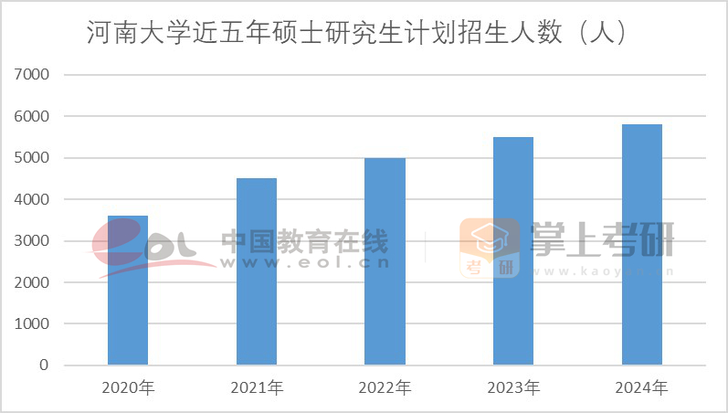 河南大學近五年碩士研究生招生計劃持續增長。由2020年的3600人,增長到2024年的5800人,五年間碩士研究生招生數量增長2200人。2024年學校招生計劃增幅為5.5%,低于去年的10%。