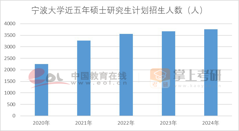 寧波大學近五年碩士研究生招生計劃持續增長。由2020年的2248人,增長到2024年的3757人,五年間碩士研究生招生數量增長1509人。2024年學校招生計劃增幅為2.45%,低于去年的2.92%。