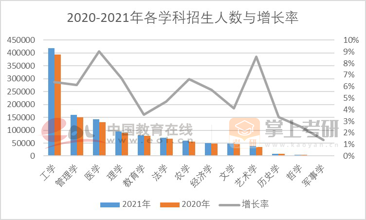 2021年研究生招生總量較上一年增長6.32%。從各學科增長率方面看,醫學是增長率最高的學科,達到了9.03%,引領了增長高點;其次是藝術學,招生人數增長率達到了8.55%。