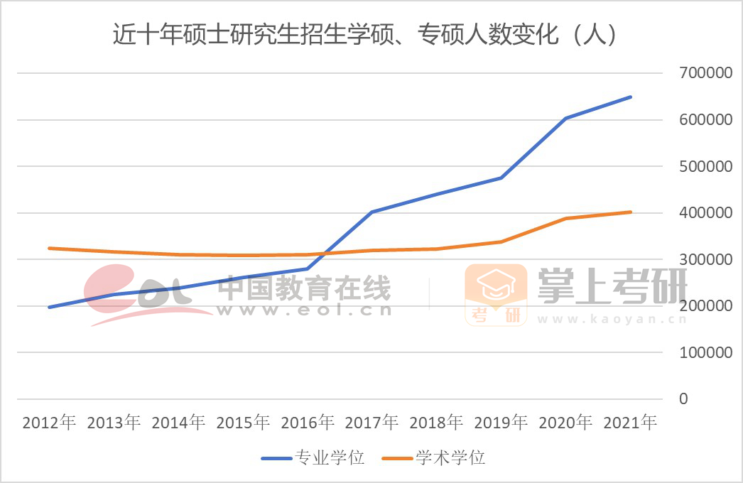 在研究生招生總人數中,專碩招生人數增長明顯。從2012年的19.7萬增長到2021年的64.9萬,專碩招生人數增長3倍多。