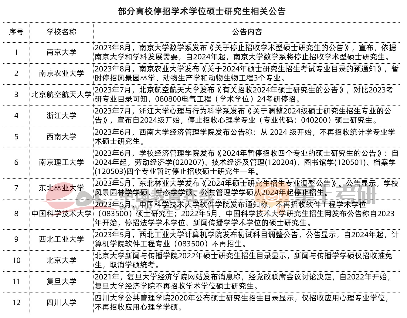 2023年6月,西南大學經濟管理學院發布公告稱:從 2024 級開始,不再招收統計學專業學術碩士研究生。此外,中國科學技術大學和西北工業大學也宣布,不再招收軟件工程學術學位碩士研究生。東北林業大學的風景園林學、公共管理學兩個學碩專業也從2024年起停止招生。