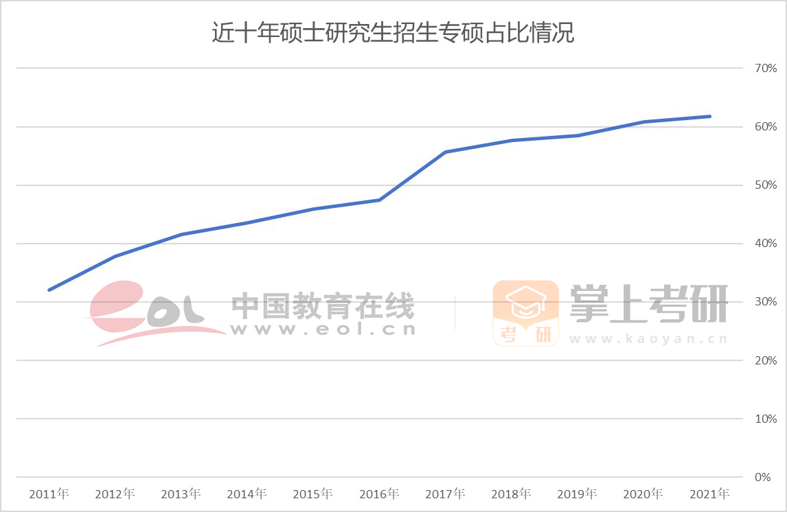 近十年碩士研究生招生中,專碩占比逐年提升,2021年占比將近62%,遠超學碩。