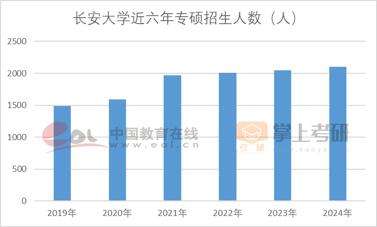 長安大學近六年來招收專業碩士人數逐年增長。從2019年招收專碩1490人,到2024年招收專碩2104人,六年間擴招專業碩士614人。