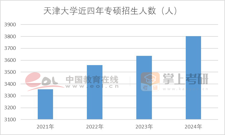 天津大學近四年來招收專業碩士人數逐年增加。從2021年招收專碩3355人,到2024年招收專碩3804人,四年間擴招專業碩士449人。