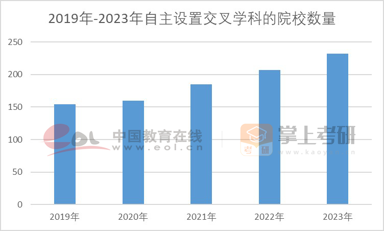 2023年我國自主設置交叉學科的院校數量為232個,相較于2022年的院校數量增加25個。從2019年到2023年,5年間我國自主設置交叉學科的院校數量增加了78個。