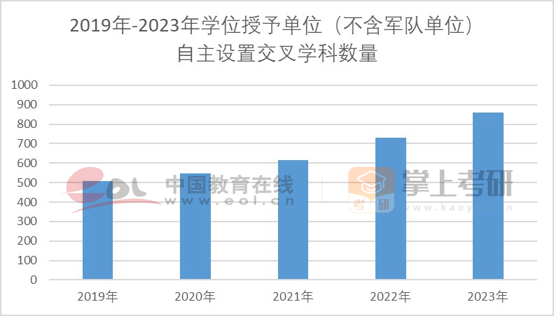 在數量方面,2023年我國學位授予單位(不含軍隊單位)自主設置交叉學科數量為860個,較2022年同比增長15.2%,2022年學位授予單位(不含軍隊單位)自主設置交叉學科數量為729個,較2021年增幅達到15.5%。2019年到2023年,5年間我國學位授予單位(不含軍隊單位)自主設置交叉學科數量增幅為40.9%。