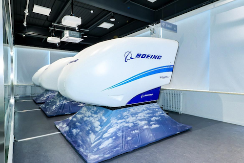 圖為:“波音·牛頓飛行學院”教室、全動態模擬飛行器、飛行平板