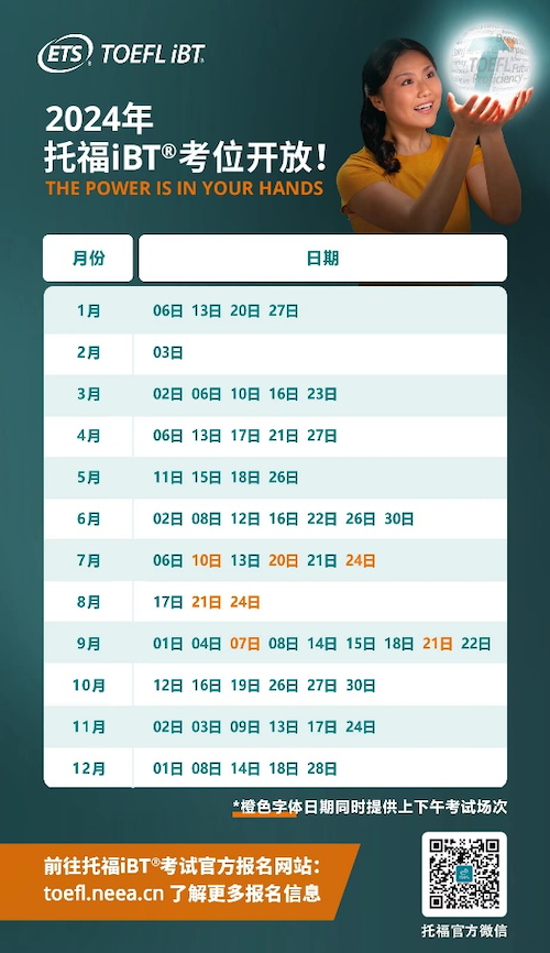 中國北京(2023年10月9日)ETS與教育部教育考試院共同研究商議并決定于2023年10月9日上午10點開放2024年的托福iBT考試和GRE普通考試的考位。2024年共開放61個考試日期的68場托福iBT考試和32個考試日期的GRE普通考試。2024年全年考試日期安排請見下表: