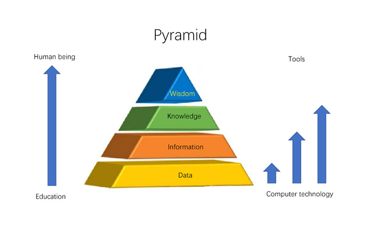 知名組織理論家羅素·艾可夫曾提出由數據、信息、知識、智慧組成的知識金字塔。在知識金字塔中,每一層都比下一層多擁有一些特質。數據來源于我們的原始觀察與度量,信息來源于我們對數據的篩選、整理與分析,知識則來源于我們對信息的加工、提取與評價,而智慧作為我們獨有的能力,意味著我們可以收集、加工、應用、傳播知識,以及預測事物的發展與未來走向。
