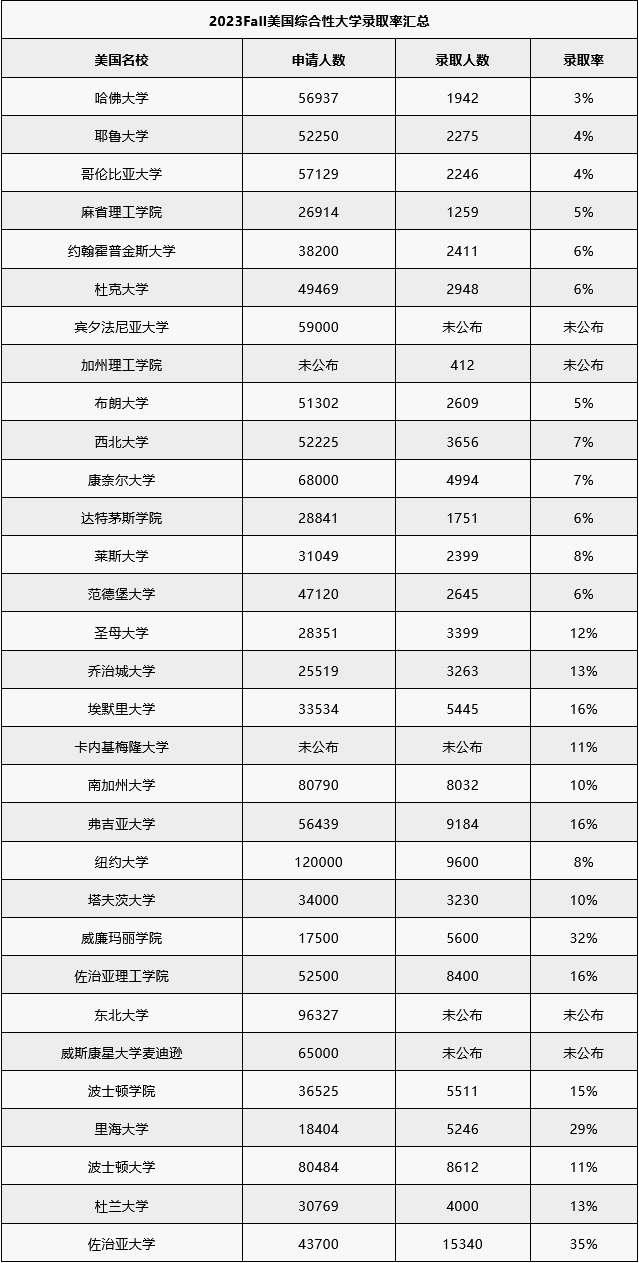 根據美國綜合大學官網公布的2023最新的錄取數據,為大家匯總排名Top50美國大學排名的部分錄取情況,表格如下: