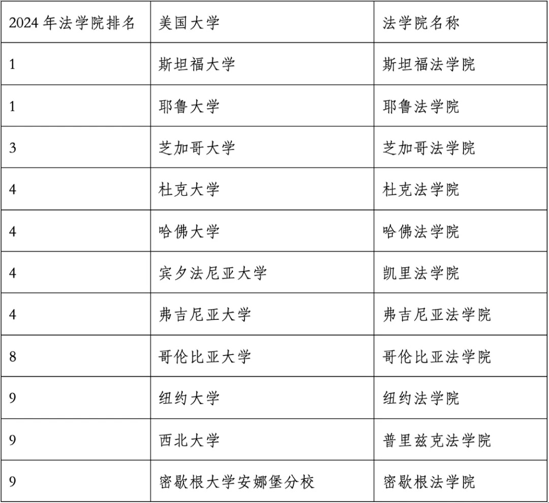 斯坦福大學、耶魯大學、芝加哥大學、杜克大學、哈佛大學、賓夕法尼亞大學、弗吉尼亞大學、哥倫比亞大學、紐約大學、西北大學、密歇根大學安娜堡分校。其中,斯坦福法學院、耶魯法學院并列全美第一。