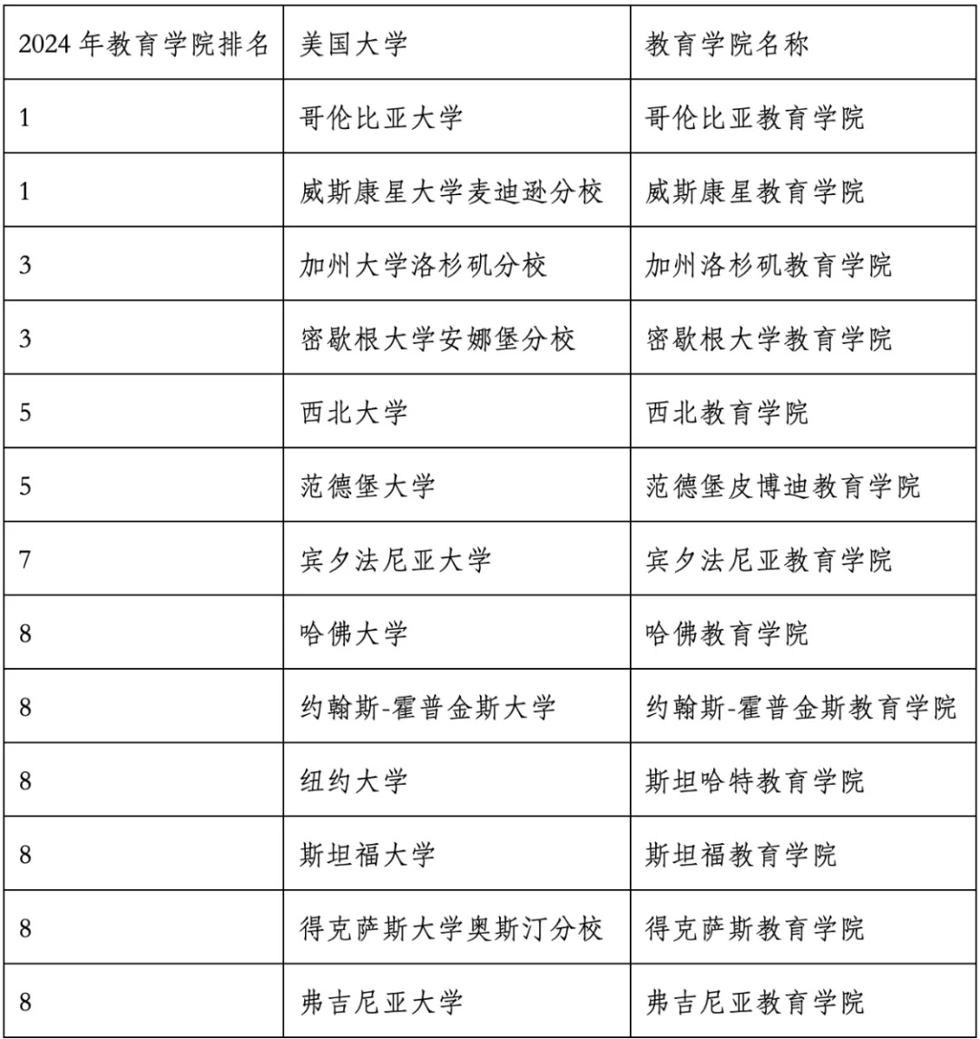 哥倫比亞大學、威斯康星大學麥迪遜分校、加州大學洛杉磯分校、密歇根大學安娜堡分校、西北大學、范德堡大學、賓夕法尼亞大學、哈佛大學、約翰斯-霍普金斯大學、紐約大學、斯坦福大學、得克薩斯大學奧斯汀分校、弗吉尼亞大學。其中,哥倫比亞教育學院、威斯康星教育學院并列全美第一。