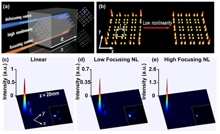 非線性調控連續譜中的高階拓撲態。a-b分別為強非線性和弱非線性調控下的示意圖;c-e分別為線性拓撲角態模式、弱自聚焦和強自聚焦非線性條件下的實驗結果
