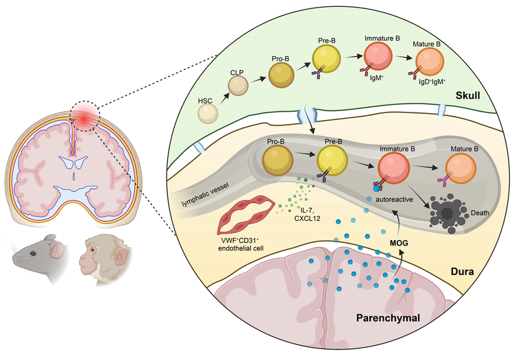 圖1. 腦膜B淋巴細胞發育與陰性篩選研究總結示意圖