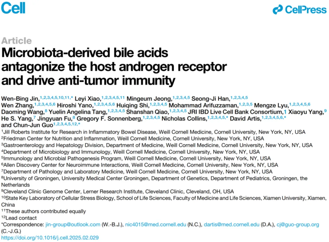 近日,廈門大學生命科學學院金文兵教授團隊在國際頂級期刊Cell上發表論文。該研究揭示了:腸道微生物產生的新型膽汁酸可以通過拮抗雄激素受體,從而調節腫瘤免疫!
