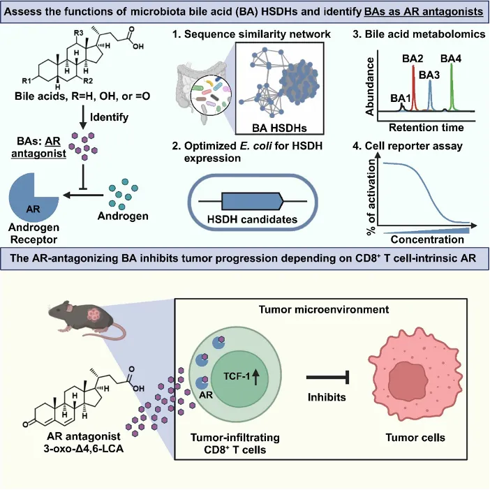 綜上所述,研究團隊通過結合生物信息學、代謝組學以及合成生物學,挖掘了腸道中廣泛存在的一系列新型膽汁酸,通過對這些膽汁酸進行活性篩選發現一類具有良好AR拮抗活性的膽汁酸,并證實該類膽汁酸可通過拮抗CD8+ T細胞中的AR在宿主體內起到抗腫瘤免疫調節的作用。