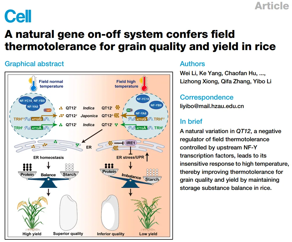 北京時間4月30日,國際期刊《細胞》(Cell)發表了華中農業大學作物遺傳改良全國重點實驗室、生命科學技術學院、湖北洪山實驗室水稻團隊李一博教授課題組題為“一個天然的基因開關系統協同賦予水稻品質和產量田間耐熱性”(A natural gene on-off system confers field thermotolerance for grain quality and yield in rice)的研究論文。