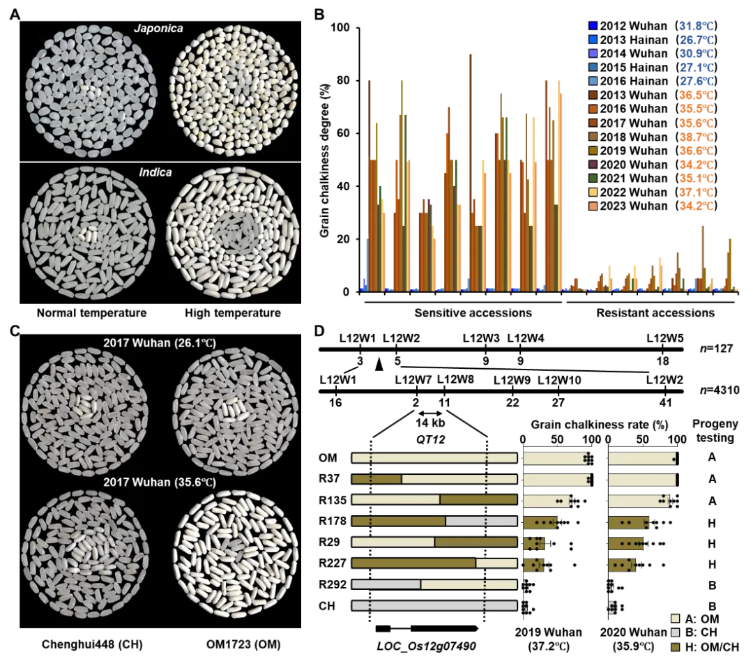 近20年來,全球氣候變化導致極端高溫天氣頻發,嚴重威脅全球農業生產,對糧食作物產量和品質的影響尤為突出。多國農業模型分析及統計數據表明,全球平均氣溫每升高1℃,將直接導致水稻產量減少6.6%–25%,同時伴隨稻米品質的嚴重劣化,給世界糧食安全帶來嚴峻挑戰。幾個世紀以來,培育優質高產作物一直是農民和育種者的目標,但人們對高溫促進堊白外觀品質形成、食味降低的分子遺傳基礎認識非常有限。