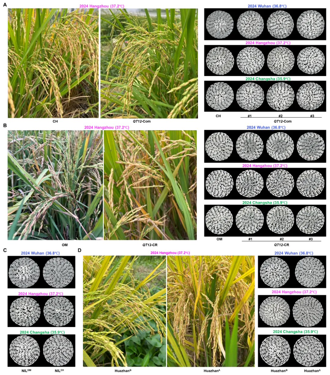 長江流域是我國第一大水稻主產區,種植面積和年產量均約占全國總量的三分之二,然而近10年來該稻區極端高溫天氣頻發,給水稻穩產與優質帶來了嚴峻挑戰。然而,QT12基因的研究為這一難題帶來了突破性解決方案。通過2023和2024年武漢、杭州和長沙等長江流域極端高溫下的大規模田間試驗,低表達QT12基因在高溫環境下表現出很強的耐熱性:與野生型相比,CRISPR編輯的QT12基因突變株系在武漢、杭州和長沙的小區產量分別提升了92.5%、64.1%和54.7%,同時顯著降低了稻米堊白率和堊白度,提升了稻米外觀品質和食味品質。