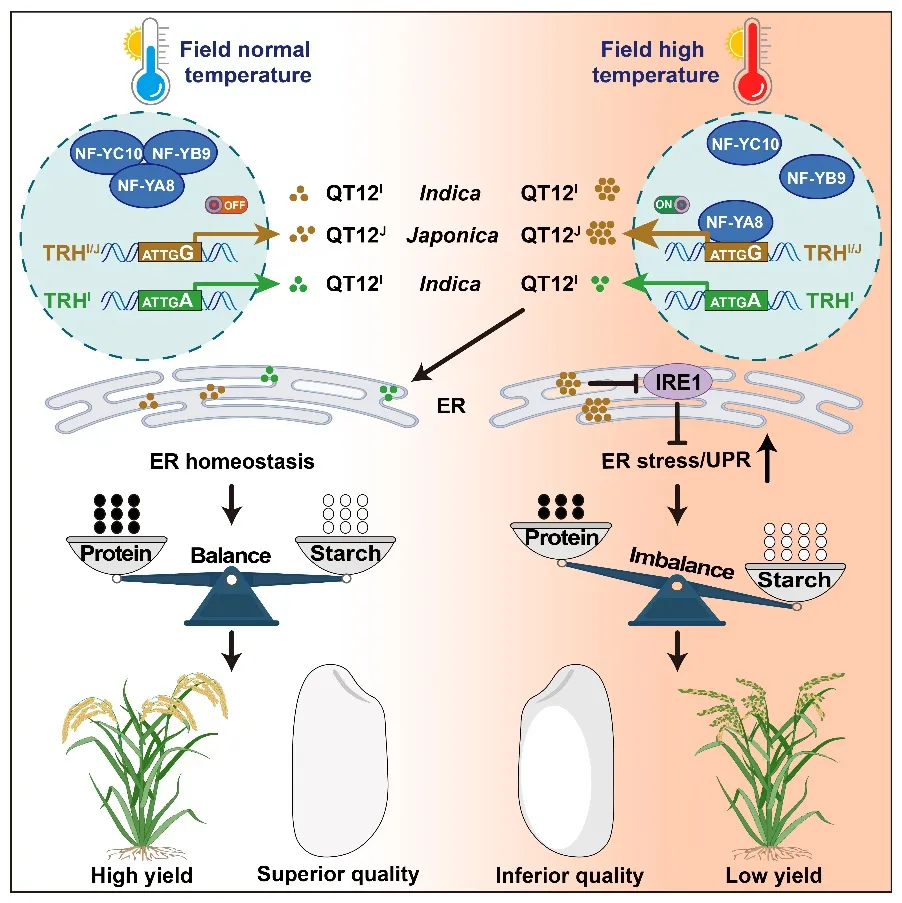 該研究首次揭示了水稻對抗高溫的秘密武器——基因QT12。它如同作物內置天然“空調系統”,調節水稻耐高溫機制。當高溫來襲,QT12自然變異與NF-Y蛋白復合體形成的初級-次級“雙生鎖”,鎖住高溫開關系統,既平衡了儲藏蛋白與淀粉的合成穩態,又穩定了稻米品質和產量,為水稻在高溫環境下的同時實現優質高產提供了全新的分子機制和綠色發展的育種策略。