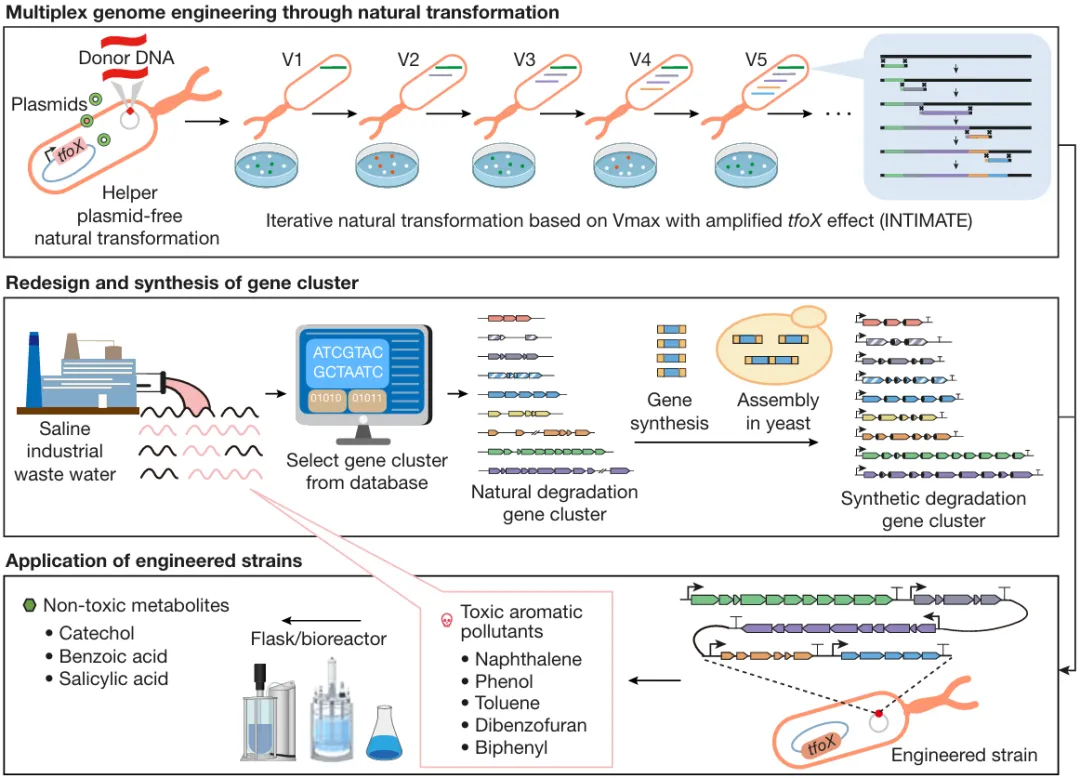 本研究成功開發了基于需鈉弧菌的復合污染物工程菌構建平臺,實現了從代謝通路的挖掘、設計和合成到單一、復合污染物降解菌株的構建、測試、以及在實際工業廢水樣本處理應用的全流程,為石化、氯堿等高鹽廢水處理、海上石油泄漏、微塑料污染等全球性挑戰提供了生物解決方案。同時,INTIMATE技術為多基因簇工程底盤的構建提供了通用技術平臺,使得同一菌株中多種代謝功能的整合以及優質菌種的迭代功能拓展成為可能,可擴展至其他污染物降解體系的構建乃至天然產物合成、高值化學品細胞工程構建等合成生物學應用場景。