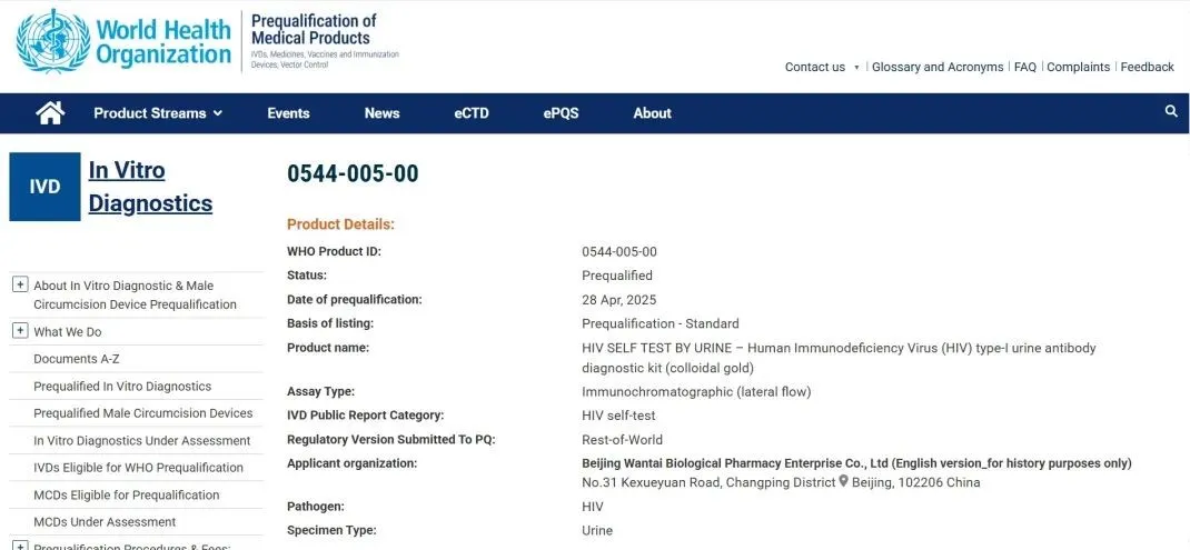 近日,由廈門大學和萬泰生物聯合研制的人類免疫缺陷病毒1型尿液抗體檢測試劑盒(膠體金法)(英文名稱:HIV SELF TEST BY URINE – Human Immunodeficiency Virus (HIV) type-I urine antibody diagnostic kit (colloidal gold),簡稱:HIV尿液自檢試劑)正式獲得世界衛生組織預認證(WHO PQ),被列入體外診斷產品預認證清單。這是全球第一個獲得WHO PQ認證的HIV尿液自檢試劑盒,也是雙方聯合研制的第三個獲此認證的HIV檢測產品,標志著我國研發機構和企業在HIV檢測領域的創新能力與產品質量再次獲得國際權威認可。
