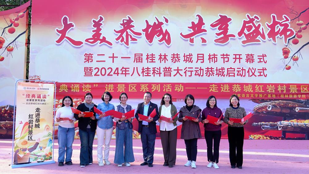 基地貫徹落實習近平總書記對“以文塑旅、以旅彰文,推動文化和旅游融合發展”的要求,打造“經典誦讀進景區”活動品牌,宣傳桂林悠久的歷史文化和文旅產業發展新態勢。2024年,成功承辦了由教育部語言文字應用管理司指導、中國教育電視臺等單位主辦的“典耀中華”主題讀書行動——全國校園節慶日誦讀融媒體直播廣西分會場活動。活動于4月21日在陽朔縣興坪古鎮碼頭直播,由學校師生、陽朔筏工及他們的家庭成員共同參與,活動反響強烈,有效宣傳了桂林市世界級旅游城市陽朔先導區的建設成效。