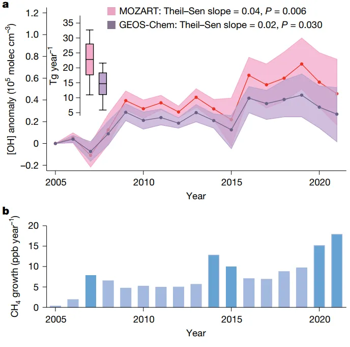 甲烷作為全球第二大溫室氣體,大氣中甲烷濃度的快速上升已成為氣候變暖的重要推動力,準確理解甲烷源匯過程及其調控機制是開展氣候變化治理的關鍵。大氣中羥基(OH)自由基是甲烷最主要的匯,當前對其濃度水平及時空變化趨勢的認知尚不清晰,對影響全球OH自由基變化的主控因子理解不足,制約了對甲烷濃度增長速率年際變率的準確理解。為解決這一問題,研究團隊自主研發了基于模型與數據雙驅動的全球大氣OH自由基量化表征系統,系統量化了2005-2021年間臭氧(O3)、一氧化碳(CO)等主要大氣污染物對OH自由基和甲烷匯的影響。研究結果揭示了大氣污染物調控OH自由基濃度水平及其時空變化,進而影響全球甲烷源匯收支的關鍵機制,闡明了近年來大氣污染物在長期趨勢上減緩甲烷增長,在特定時段推動甲烷濃度異常波動的復雜機制。