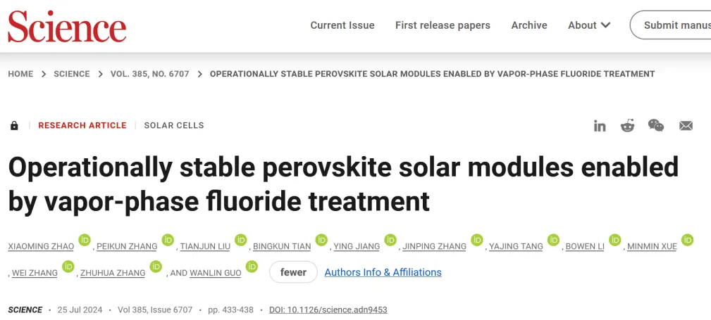 南京航空航天大學國際前沿科學研究院郭萬林教授和趙曉明教授團隊繼2024年7月開發氣相氟化技術實現大面積鈣鈦礦太陽能電池的均勻穩定化后,于2025年5月30日再次在《Science》發表最新成果“Vapor-assisted surface reconstruction enables outdoor-stable perovskite solar modules”,開發了更綠色、更具經濟性的氣相輔助表面重構技術,抑制了產業級鈣鈦礦模組在戶外環境下的不可逆退化,在30 cm × 30 cm鈣鈦礦模組中首次實現與商用晶硅太陽能電池相當的戶外運行穩定性。