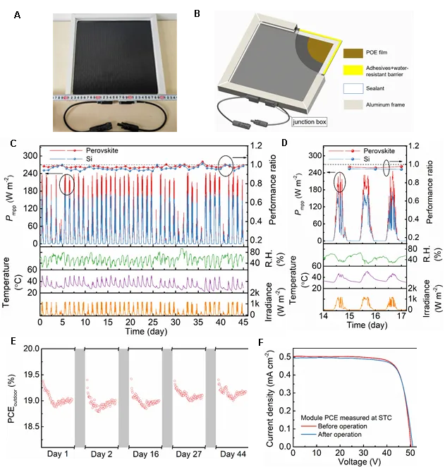 為了進一步考察鈣鈦礦模組的戶外穩定性,在高溫高濕的夏季將鈣鈦礦模組和商用晶硅太陽能電池一起對比,發現產業級鈣鈦礦模組展示出與商用晶硅太陽能電池相當的穩定性。并且由于鈣鈦礦電池較低的溫度系數,其在高溫條件下的功率保持率甚至優于晶硅太陽能電池,證明了鈣鈦礦太陽能電池實際應用的可能性。