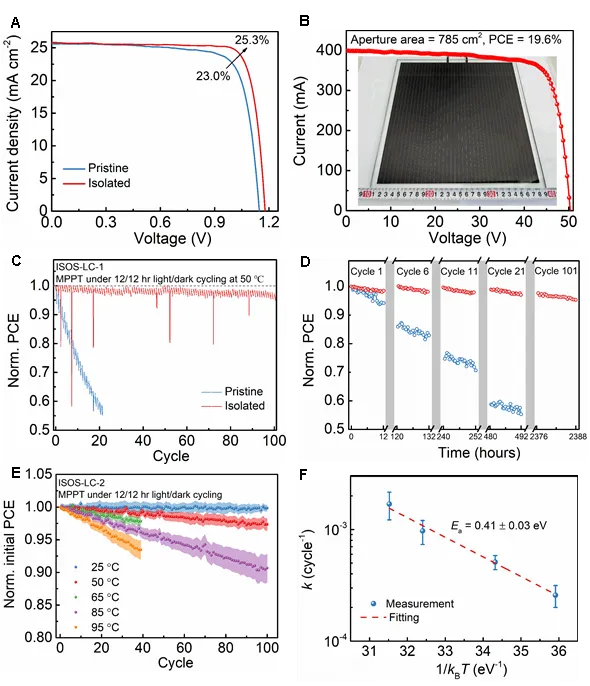 經過氣相輔助表面重構的太陽能電池實現了更高的光電轉換效率和穩定性。0.16cm2單元電池和785cm2太陽能模組的PCE分別為25.3%和19.6%。光/暗循環加速老化測試結果表明,模組的預計T80壽命(效率下降至初始效率的80%所需的時間)達到2478次循環(等效于25℃環境下循環運行超過6.7年),為報道中最具穩定性的鈣鈦礦模組。