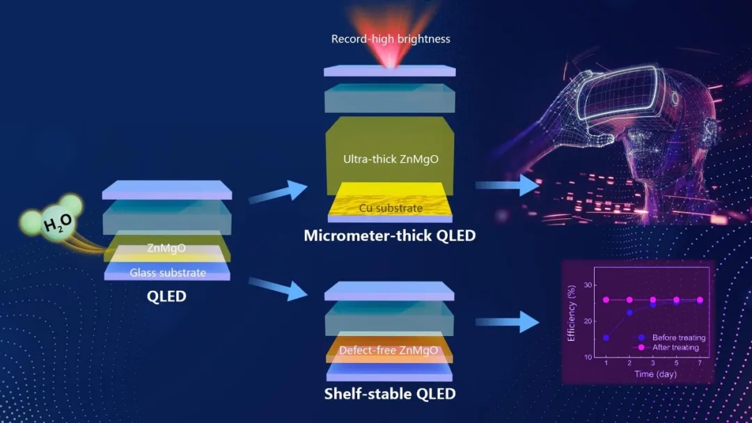 研究提出了水處理ZnMgO電子輸運層的新方法,有效鈍化了ZnMgO的缺陷,并顯著提高了ZnMgO的導電性,實現了微米級厚度及發光穩定的高性能QLED。