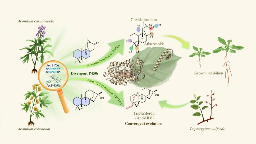 研究揭示了雷公藤福定生物合成在毛茛科黃花烏頭與衛矛科雷公藤植物中的趨同進化以及烏頭屬二萜的化感作用及其作為植物生長調節劑的開發應用潛力,為烏頭屬植物復雜結構二萜生物堿的下游生物合成通路解析奠定了基礎。