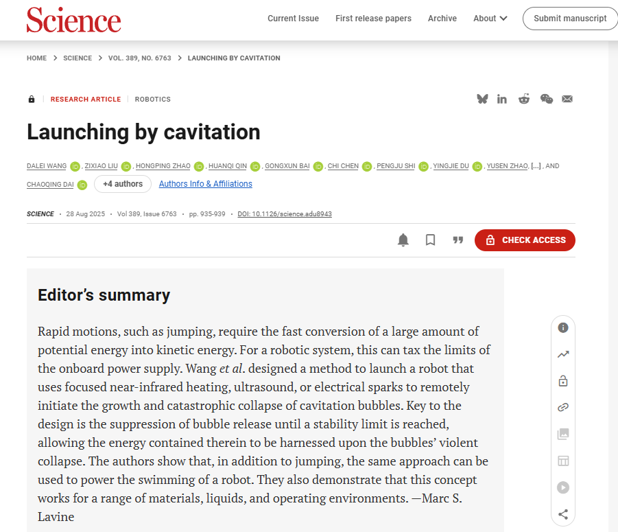 8月29日,浙江農林大學全國重點實驗室戴朝卿教授團隊與加州大學洛杉磯分校賀曦敏教授團隊合作,在國際頂級學術期刊Science上發表了題為Launching by Cavitation的研究論文。這也是浙江農林大學學者首次以第一完成單位和通訊作者單位在Science雜志上發表研究論文。